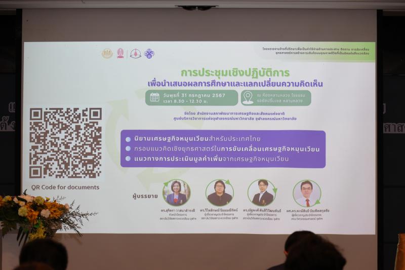 ทั้งนี้ มีการนำเสนอผลการศึกษาจากคณะที่ปรึกษาฯ ใน 3 หัวข้อ ได้แก่ (1) ผลการศึกษาในส่วนนิยามเศรษฐกิจหมุนเวียนสำหรับประเทศไทยและกรอบแนวคิดเชิงยุทธศาสตร์ในการขับเคลื่อนเศรษฐกิจหมุนเวียน โดย ดร.สุจิตรา วาสนาดำรงดี หัวหน้าโครงการ (2) ผลการศึกษาถอดบทเรียนต้นแบบธุรกิจที่สอดคล้องกับหลักเศรษฐกิจหมุนเวียนและ แนวทางการประเมินมูลค่าเพิ่มจากเศรษฐกิจหมุนเวียนในระดับอุตสาหกรรม โดย ดร.วิไลลักษณ์ นิยมมณีรัตน์ และ ดร.ณัฐพงศ์ ตันติวิวัฒน์พันธ์ ผู้เชี่ยวชาญประจำโครงการ และ (3) แนวทางการประเมินมูลค่าเพิ่มจากเศรษฐกิจหมุนเวียนระดับมหภาคและข้อเสนอแนะ โดย ผศ.ดร.พงษ์สันธ์ บัณฑิตสกุลชัย ผู้เชี่ยวชาญประจำโครงการ และ ดร.สุจิตรา วาสนาดำรงดี หัวหน้าโครงการ
